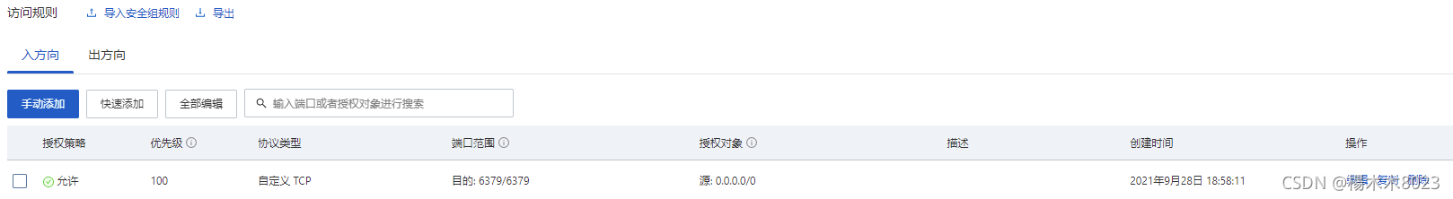 (3) 进入安全组之后,可以手动添加端口,假设redis服务开启的6379端口,添加如下。