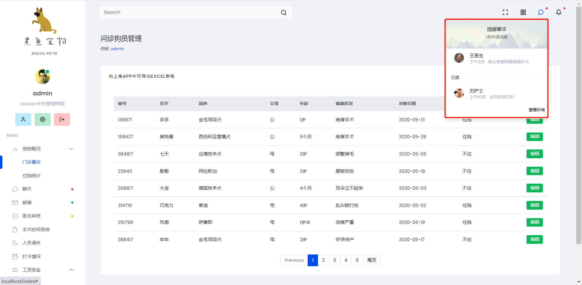 前台显示医院文化信息,可在线挂号,在线预约,在线查看专家信息和宠物常见病治疗方法,可充值享受专家1v1在线服务后台显示会诊宠物信息,医院人员信息,医生信息,医院人员排班,人员调休,打卡情况,工资奖金,手术安排等。