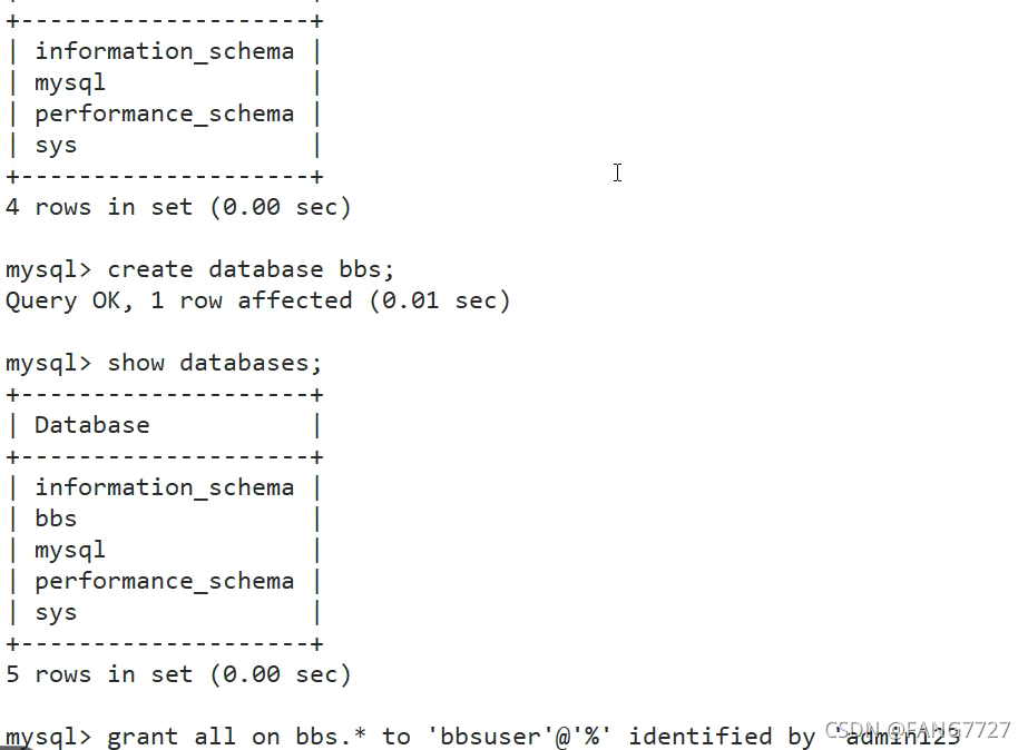 mysql> grant all on bbs.* TO 'bbsuser'@'%' IDENTIFIED BY 'admin123';