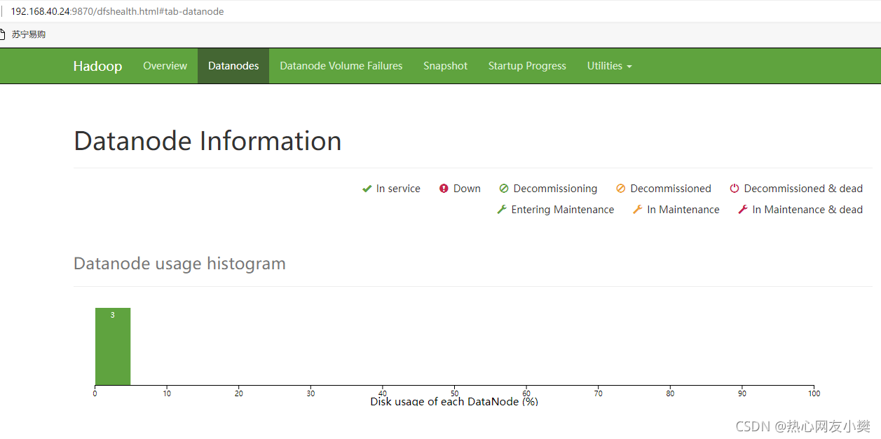 给予该脚本一定权限 ?? ?chmod 777 shell.sh 查看该目录下的文件权限 ?? ?ls -al 运行脚本 1.进入该目录 ?? ?cd /root/shell ?? ?./shell.sh status(查看服务状态) ?? ?./shell.sh start(运行服务) ?? ?./shell.sh stop(停止服务) 2.在根目录下 ?? ?./shell/shell.sh status ?? ?./shell/shell.sh start ?? ?./shell/shell.sh stop 10.在浏览器打开hadoop ?? ?192.168.40.24:9870(第一台虚拟机的ip地址:9870)