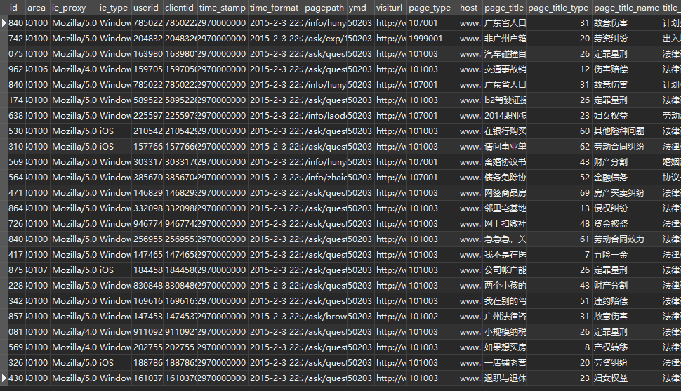 本任务抽取部分地区的用户访问数据进行分析,其数据量总计有837450条记录,部分数据如图5-46所示。其中包括真实IP、地区编号、浏览器代理、用户浏览器类型、用户ID、客户端 ID、时间霞、标准时间、页面路径、年月日、访问网页、页面类型、主机名、页面标题等。