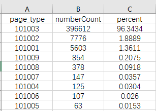 针对原始数据中的用户点击的网页类型进行统计,网页类型是指"网址类型"中的前3位数字(它本身有6或7位数字)。统计内容为:网页类型、记录数以及其所占百分比,统计结果以csv文件保存。