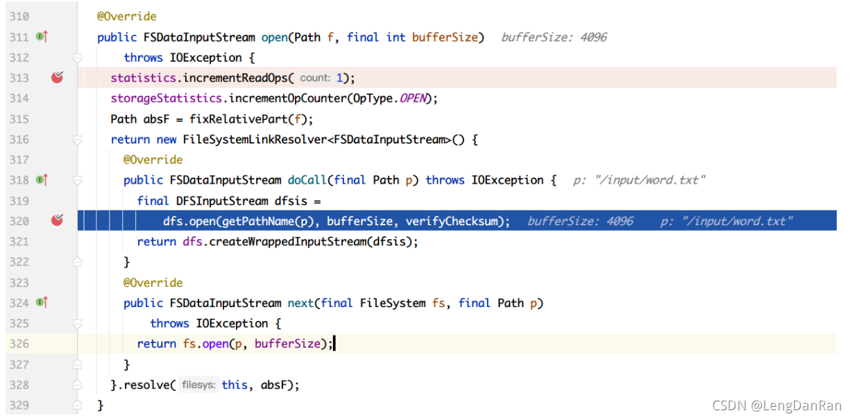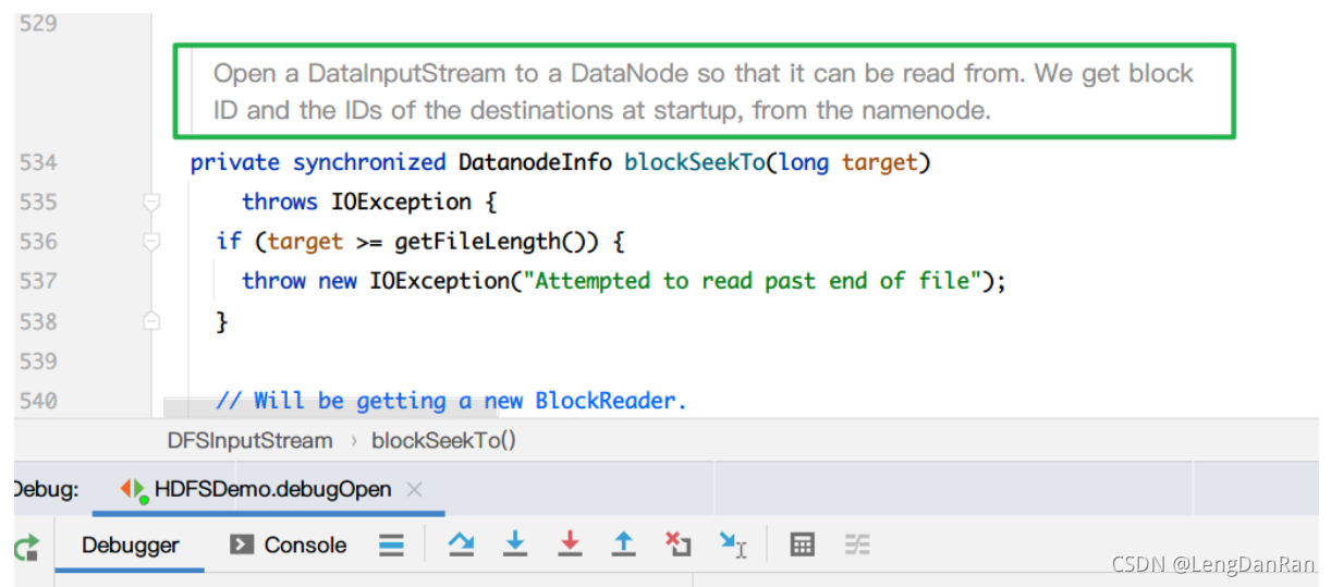 客户端调用open()方法后,会返回一个FSDataInputStream对象供用户读取数据,而FSDataInputStream会在一个FileSystemLinkResolver中封装成DFSInputStream对象,而这就是关键的对象,它管理着HDFS的IO流程。