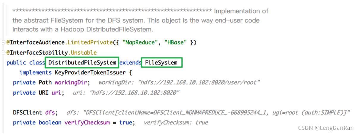 对于HDFS来说,FileSystem是由其子类DistributeFileSystem的一个实例来完成的: