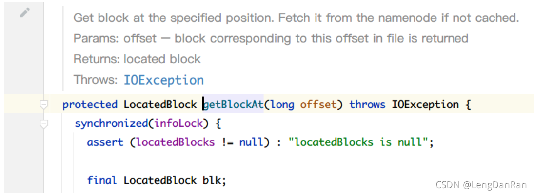 接着会根据偏移量来得到一个目标DataNode,具体的方法为getBlockAt():