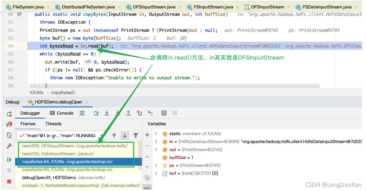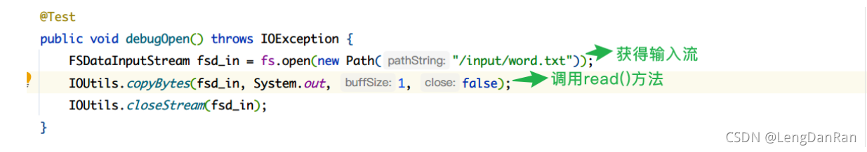 Hadoop提供的IOUtils.copyBytes()方法会去调用输入流中的read()方法,获得数据