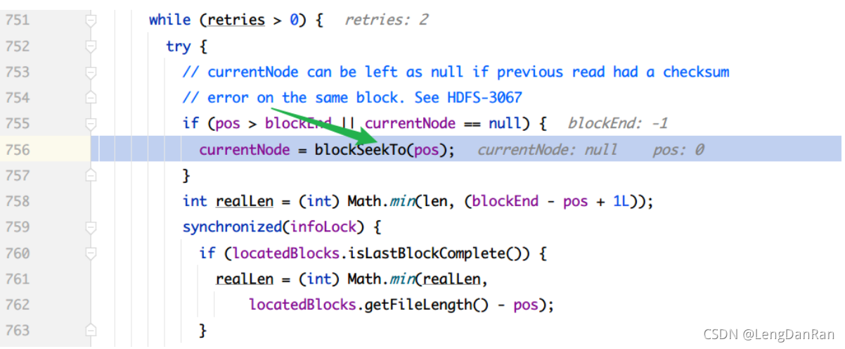 在readWithStrategy中,会调用blockSeekTo()方法,会去寻找当前需要访问的DataNode节点信息。