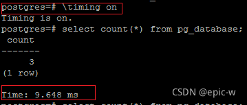 \timing on --打开耗时统计? 执行完成后,后面在psql命令行上执行的SQL语句就会有时间统计了。