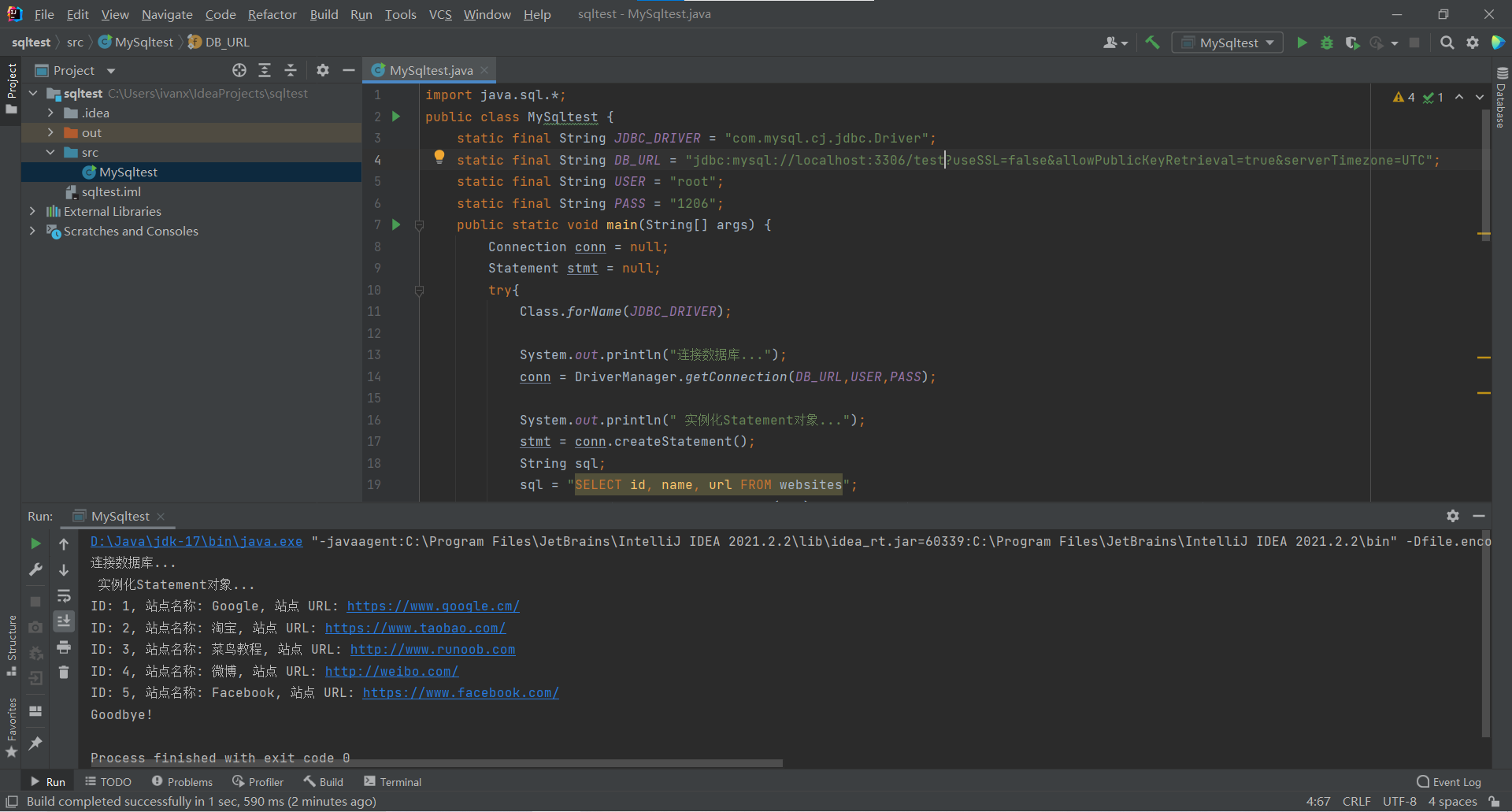 static final String DB_URL = "jdbc:mysql://localhost:3306/test?useSSL=false&allowPublicKeyRetrieval=true&serverTimezone=UTC";