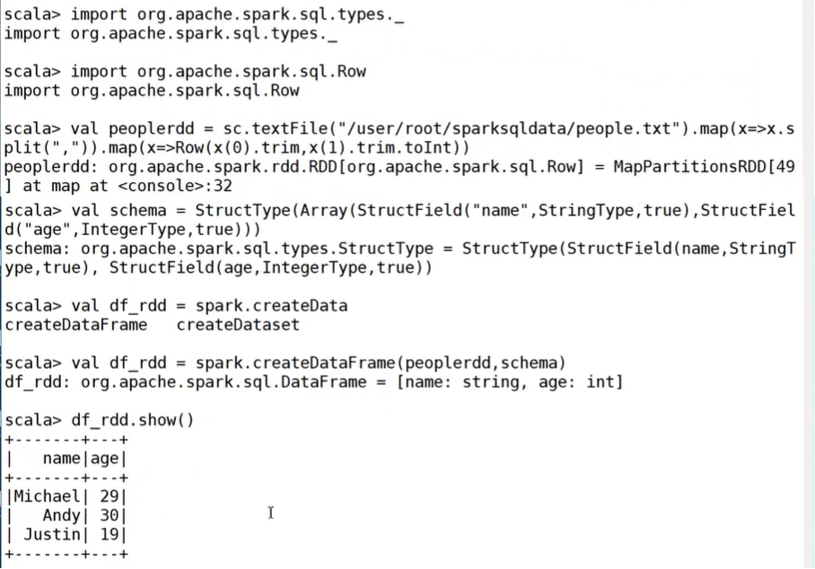 - 利用反射机制推断RDD模式,使用这种方式首先需要定义一个case class,因为只有case class才能被Spark隐式地转换为DataFrame。