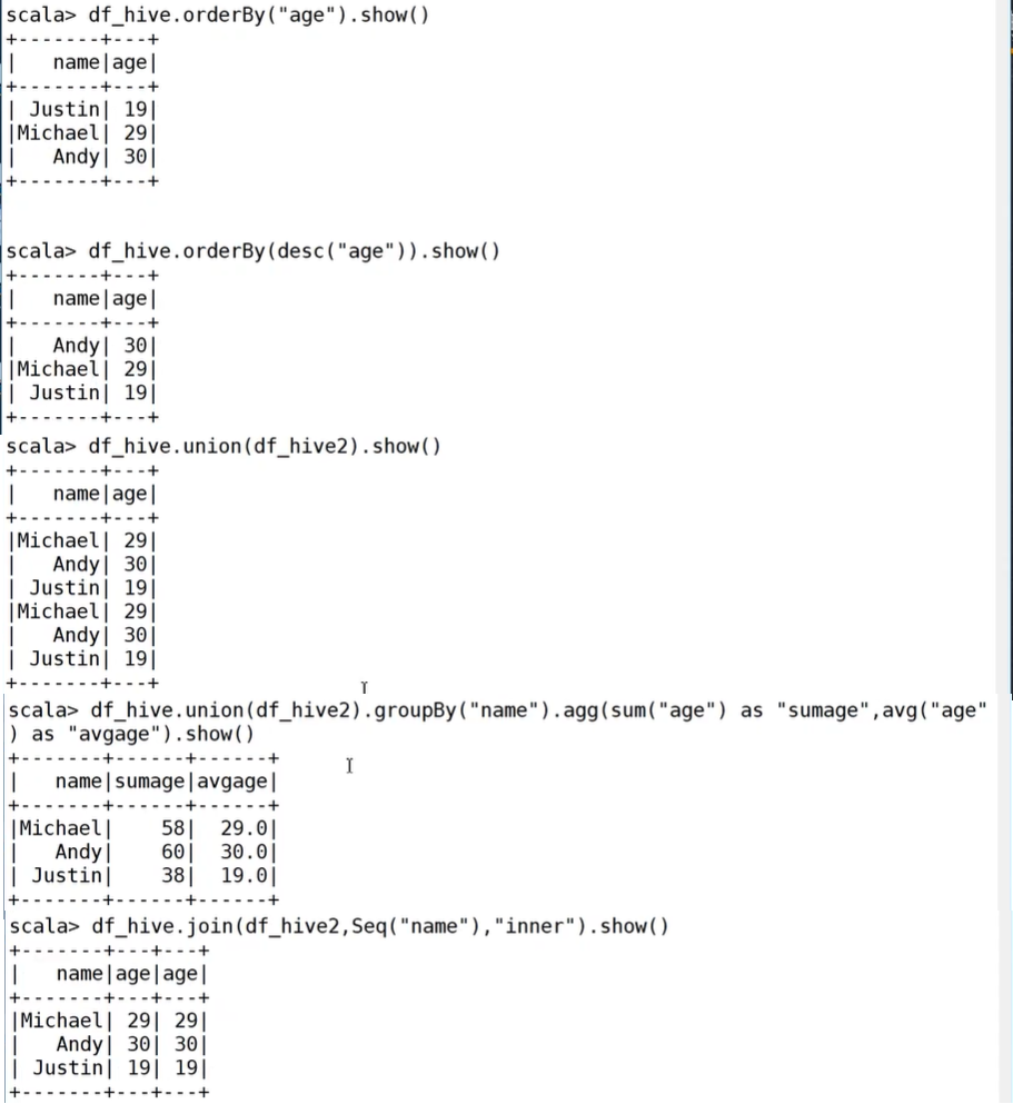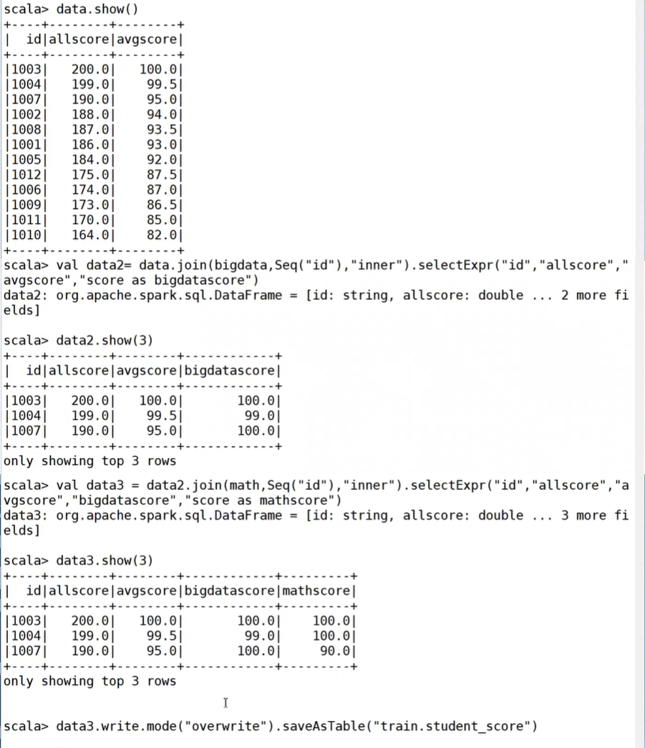 df.write.mode("overwrite"). saveAsTable(tableName: String)  hive查看(先进入train数据库,然后再查看):