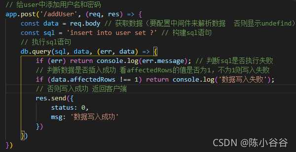 if (data.affectedRows !== 1) return console.log('数据写入失败');