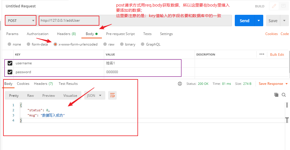 打开Postmon 发送post请求 ,输入http://127.0.0.1/addUser来验证是否在客户端成功打印了数据,打印成功显示如下页面: