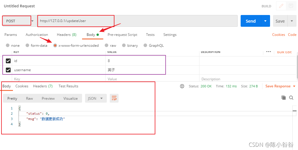 ??打开Postmon 发送post请求 ,输入http://127.0.0.1/updateUser来验证是否在客户端成功打印了数据,打印成功显示如下页面: