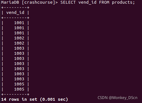 在检索有些表列的时候,重复项很多,若只想要不同的值的话就需要使用DISTINCT关键字