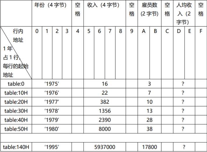 编程,将 data 段中的数据按如下格式写入到 table 段中,并计算 21 年中的人均收入 (取整),结果也按照下面的格式保存在 table 段中。