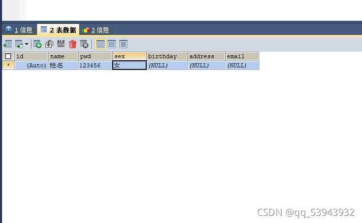 `sex` VARCHAR(2) NOT NULL DEFAULT '女' COMMENT '性别',