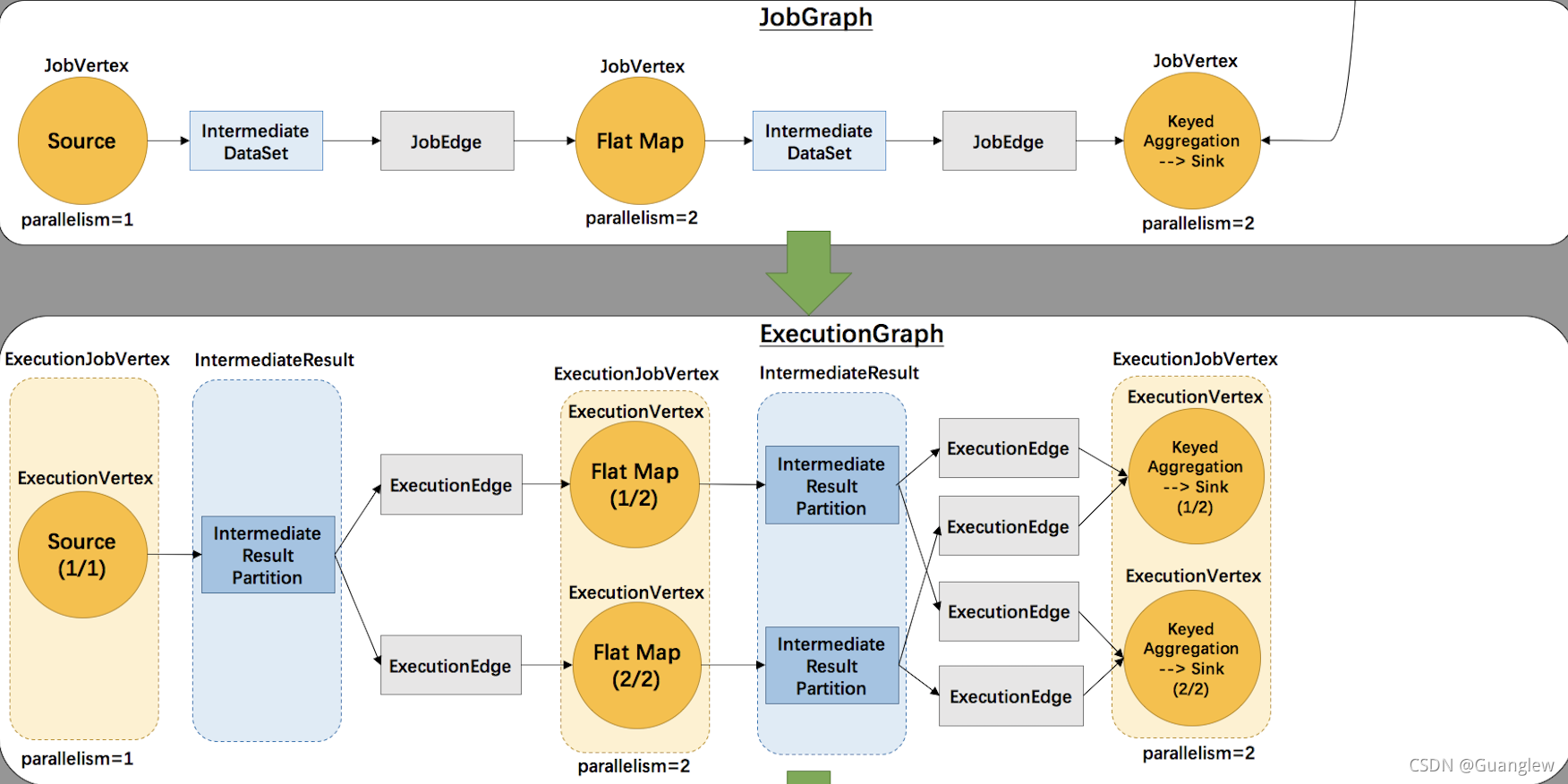 JobManager 根据 JobGraph 生成 ExecutionGraph。ExecutionGraph 是 JobGraph 的并行化版本,是调度层最核心的数据结构。