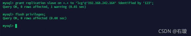grant replication slave on *.* to 'lcg'@'192.168.242.164' identified by '123';