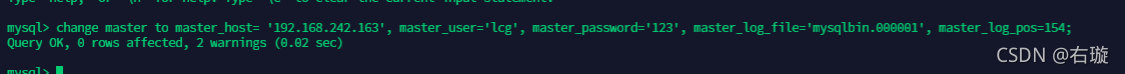 change master to master_host= '192.168.242.163', master_user='lcg', master_password='123', master_log_file='mysqlbin.000001', master_log_pos=154;