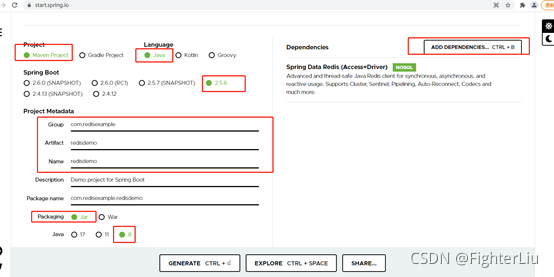 选择Project,Language,Springboot版本。填写Group,Artifact,Name,选择packaging,