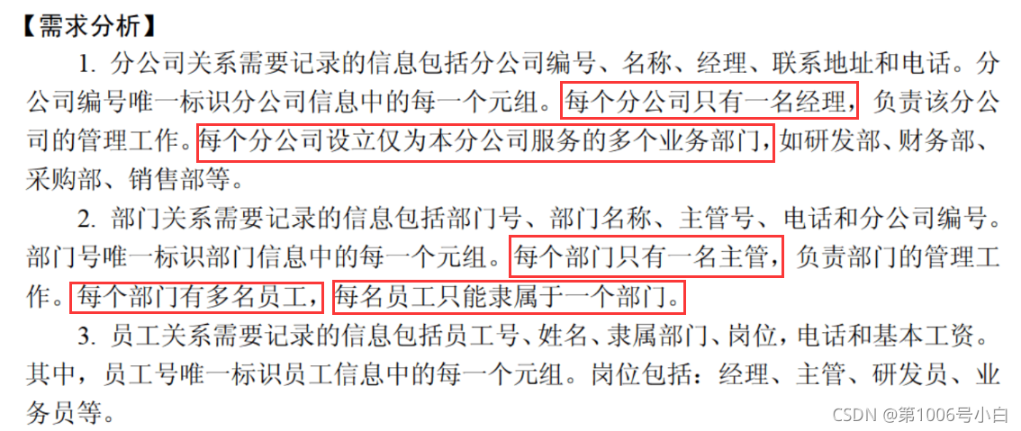 一个一个比对 分公司还缺经理、部门缺主管号,分公司编号、员工缺隶属部门、岗位 (a)经理 (b)主管号,分公司编号 (c)隶属部门、岗位 这道题目恰好结果就是这个,但是我们在进行转换成逻辑结构设计的时候,要关注多重度 1对1:将一个实体的主键增加到另一个实体的关系模式里面 1对多:将一个实体的主键增加到多的那个实体的关系模式里面 多对多:将他们之间的联系本身转成一个实体,然后增加多对多两个实体的主键