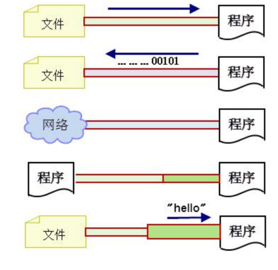 常见的应用: ? 读取硬盘上的文件内容到程序。例如:播放器打开一个视频文件、word 打开一个 doc 文件。 ? 读取网络上某个位置内容到程序。例如:浏览器中输入网址后,打开该网址对应的 网页内容;下载网络上某个网址的文件。 ? 读取数据库系统的数据到程序。 ? 读取某些硬件系统数据到程序。例如:车载电脑读取雷达扫描信息到程序;温控系 统等。