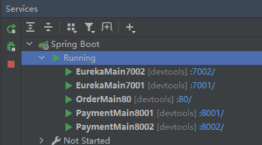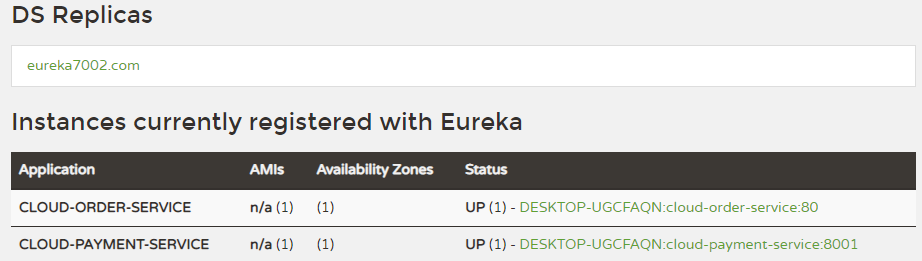 运行两个注册的微服务,访问http://localhost:7001/可以看到:  两个微服务为前一章节的支付模块和订单模块。
