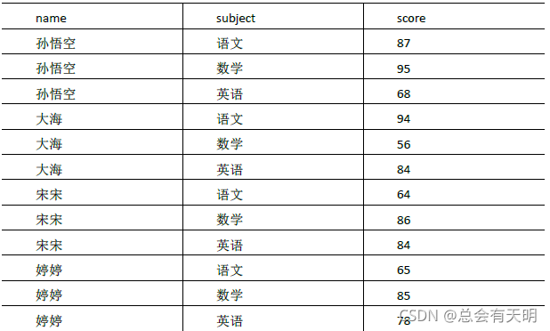 大海 语文 94 1 1 1 孙悟空 语文 87 2 2 2 婷婷 语文 65 3 3 3 宋宋 语文 64 4 4 4