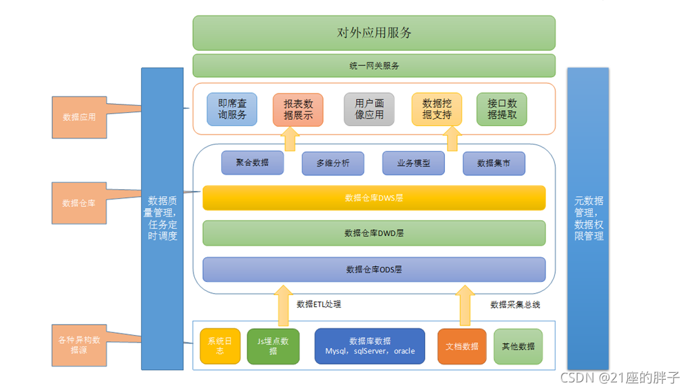 ODS层:外部数据源ETL到数仓里最原始的数据 DWD层:对ODS层中的表按一定主题进行划分和加工,内容还是明细数据 DWS层:对DWD层数据进行汇总 ADS层:数据应用层,分析报表等。 DM层:data mart,数据集市,为特有业务独立提取出数据,针对性强。