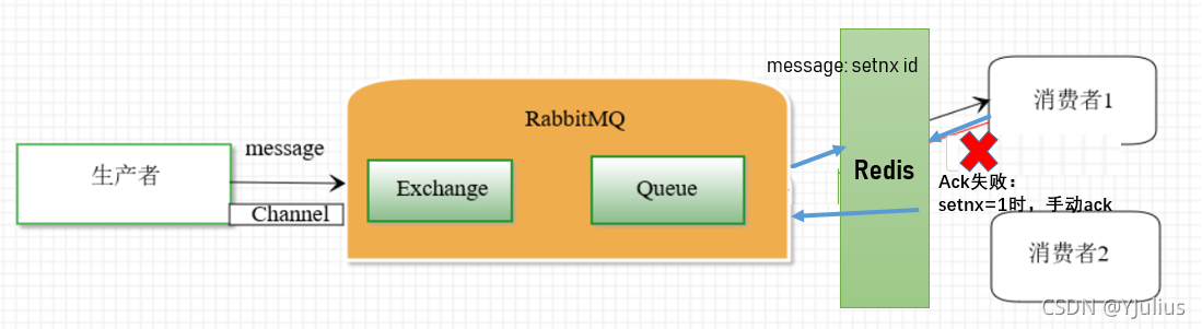 若手动ack失败,在RabbitMQ将消息交给其他的消费者时,先执行setnx,若key已经存在,则获取他的值,如果值为0,即当前消息还没消费完,当前消费者就什么都不做,如果值为1,则直接ack操作。