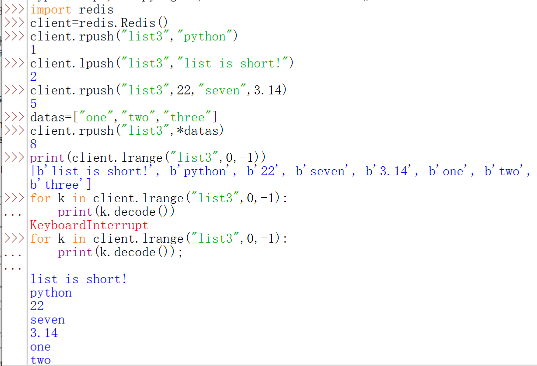 print(client.lrange(“list3”,0,-1)) [b’list is short!’, b’python’, b’22’, b’seven’, b’3.14’, b’one’, b’two’, b’three’]