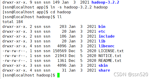 [ssn@localhost app]$ ln -s hadoop-3.2.2 hadoop