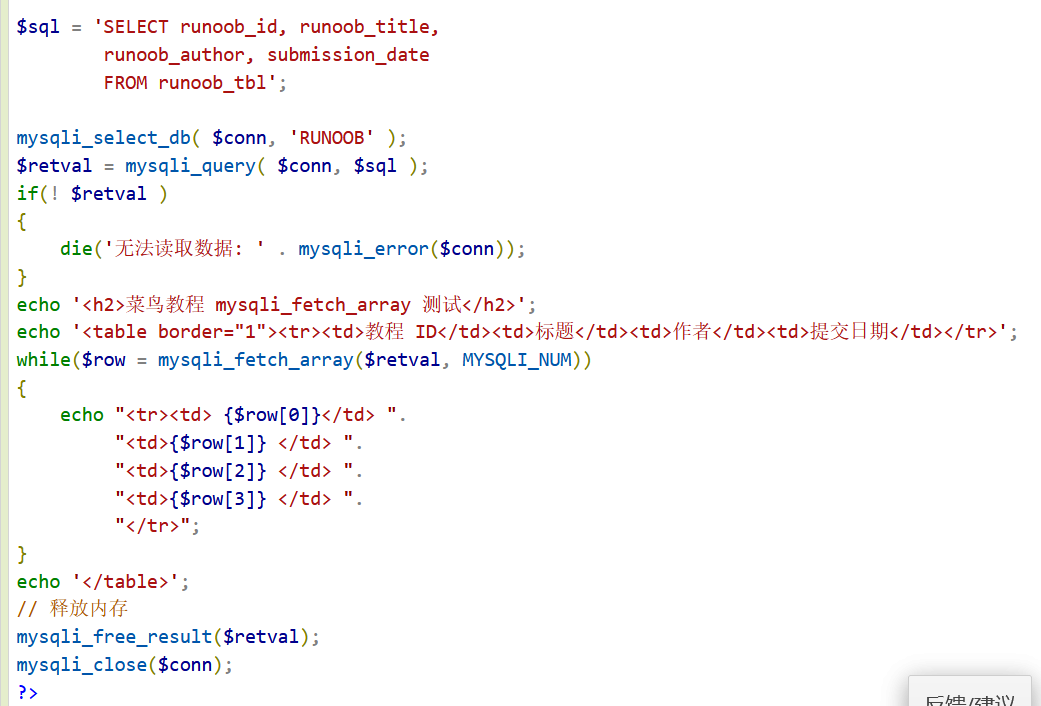 使用常量 MYSQLI_NUM 作为 PHP mysqli_fetch_array() 函数的第二个参数,返回数字数组 内存释放:执行完select 释放游标内存,使用mysqli——free——result()实现内存释放