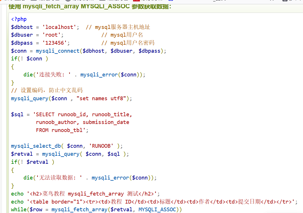 使用php脚本获取数据 使用mysqli_query()和sql select命令获取数据 使用mysqli_fetch_array()来使用和输出所有查询的数据 读取的每条记录赋值给$row然后在打印每个值,如果需要在字符串中使用变量,将变量至于花括号 mysqli_fetch_assoc(), 该函数从结果集中取得一行作为关联数组。 返回根据从结果集取得的行生成的关联数组,如果没有更多行,则返回 false。