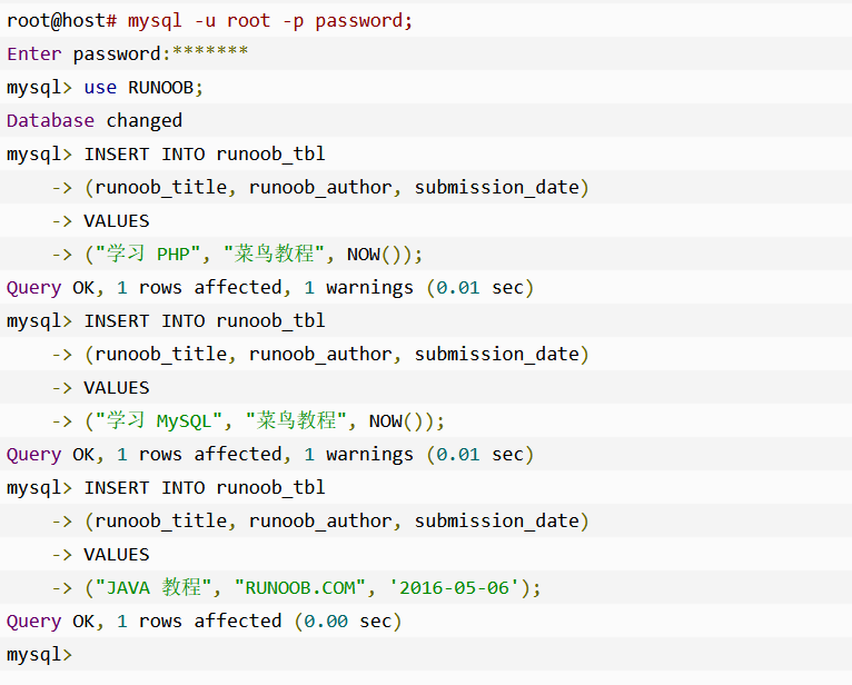 1 ,insert into 表名( field1, field2,…fieldN ) values ( value1, value2,…valueN ); 2,通过命令提示窗口插入数据