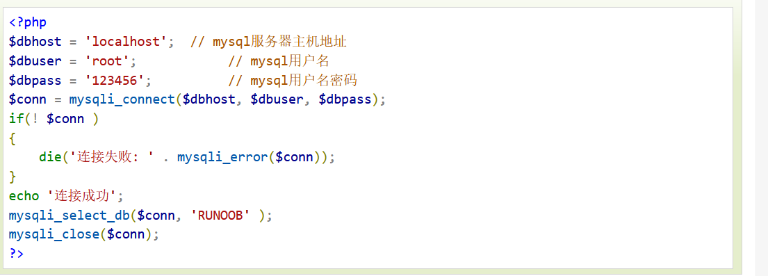 1,使用二进制方式连接 mysql -u root -p 2,使用php脚本连接(mysqli_connect()) mysqli_connect(主机名,用户名,密码,默认使用的数据库,连接数据库的端口号,规定socket或者要使用的已命名的pipe); (1),使用mysqli_close()断开MySQL数据库的连接bool mysqli_close ( mysqli $link)