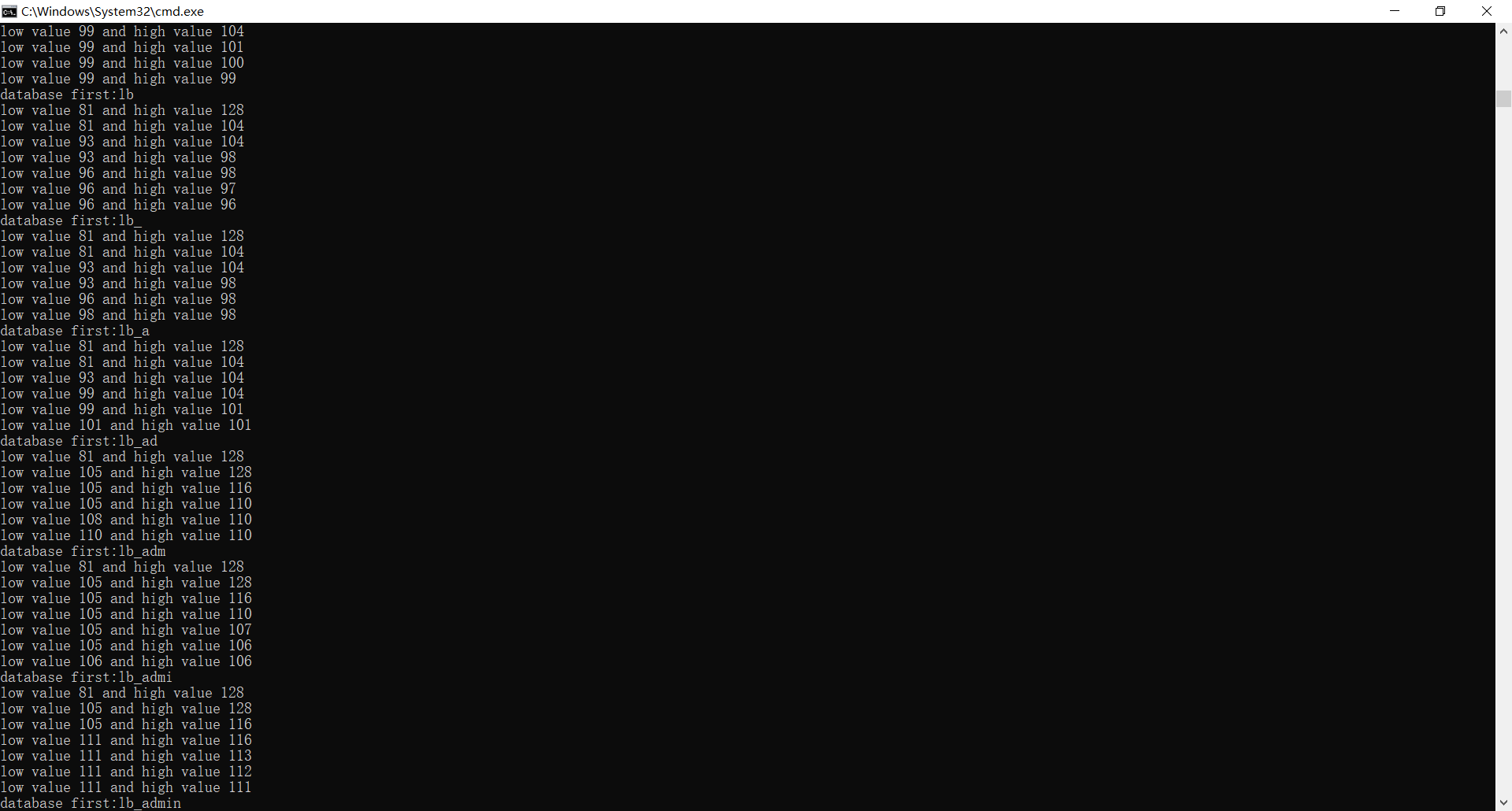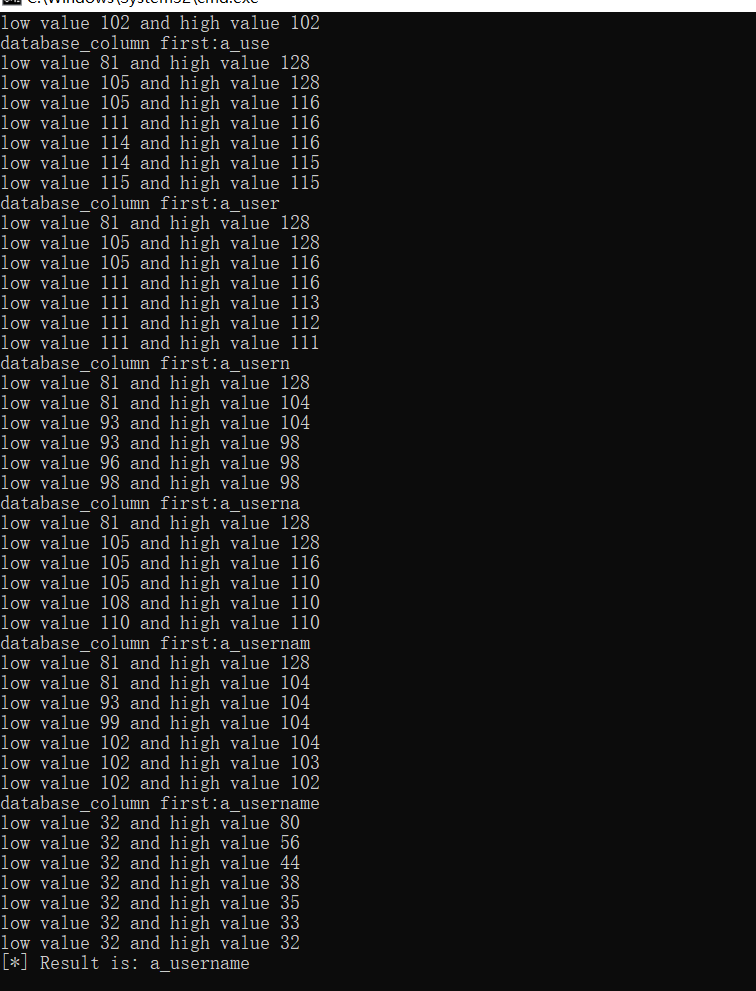 二分法的思路就是在j的区间做处理,减少j的取值, low=32,high=128,mid=80,user(),{i},1通过比较是否小于80,具体缩小到某个小区间内。。