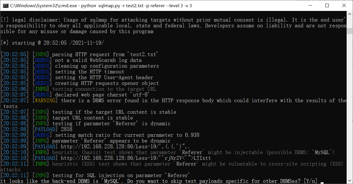 是一个from子查询payload,select*from(select sleep(10))a ,from会把后面的结果(在这里是子查询)当作单表来查询,  发包后,burpsuite返回包1154millls,存在sql注入,,不知道有多久没手工注入了,放sqlmap看能不能跑点数据出来 如图,referer注入设置level 3 ,time-base设置 technique T,跑不出注入点,欸,失望  明明有个注入点,就相当撕开了一个缺口,但迟迟找不到工具,一个人的孤独,一个人的渗透 找了位盆友,写了个枚举盲注,,