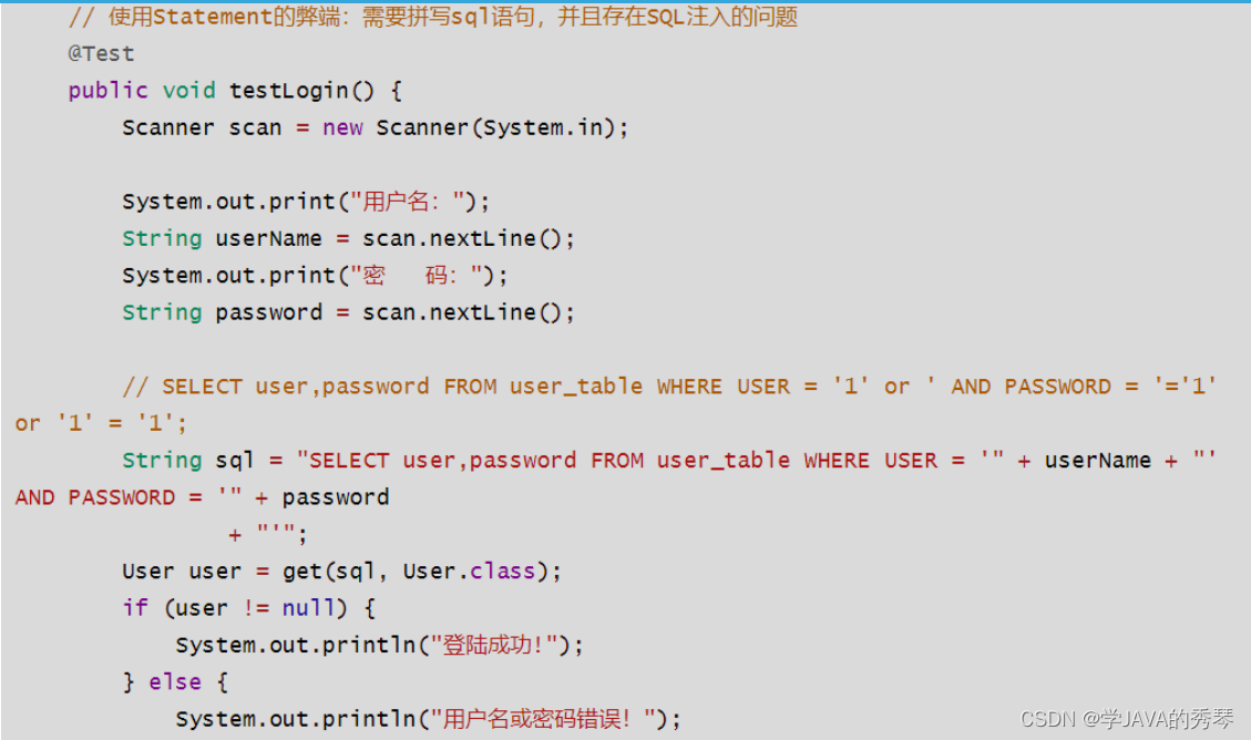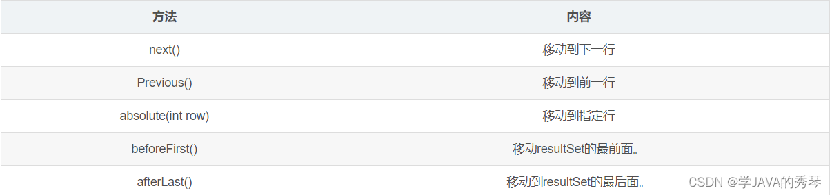 ????????Statement接口创建之后,可以执行SQL语句,完成对数据库的增删改查。其中 ,增删改只需要改变SQL语句的内容就能完成,然而查询略显复杂。在Statement中使用字符串拼接的方式,该方式存在句法复杂,容易犯错等缺点,具体在下文中的对比中介绍。所以Statement在实际过程中使用的非常的少,所以具体的放到PreparedStatement那里给出详细代码。