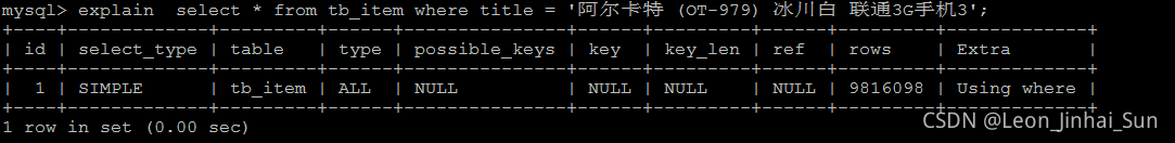 explain select * from tb_item where title = '阿尔卡特 (OT-979) 冰川白 联通3G手机3';