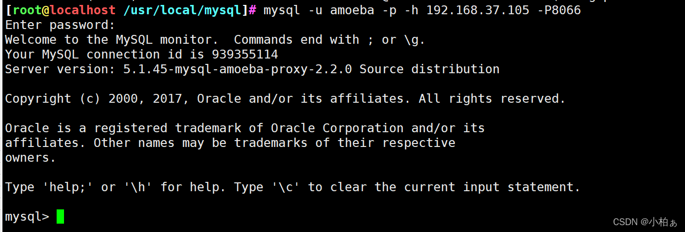 [root@localhost /usr/local/mysql]# mysql -u amoeba -p -h 192.168.37.105 -P8066