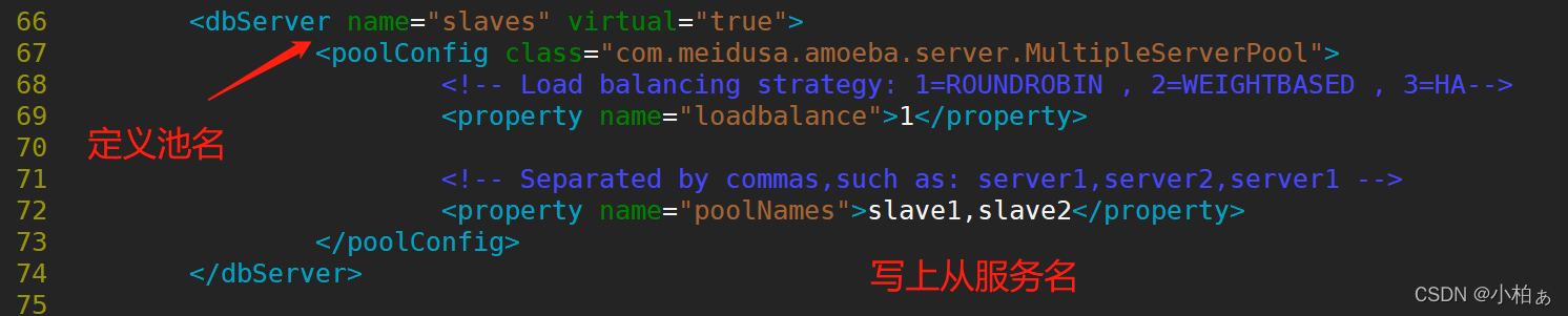 [root@localhost /usr/local/amoeba/conf]# cp dbServers.xml dbServers.xml.bak