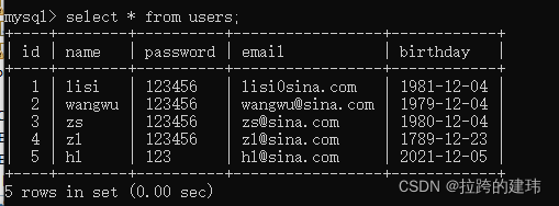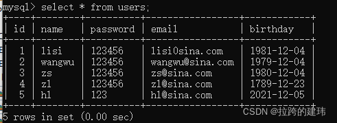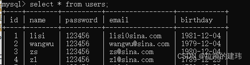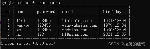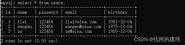 VALUES('lisi','123456','lisi0sina.com','1981-12-04');
