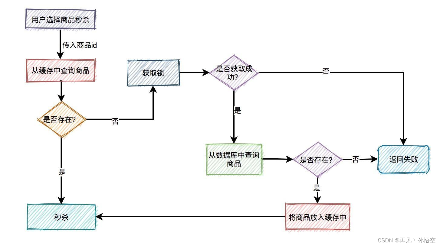 - 添加缓存可以避免请求直接打到数据库。具体过程如下:根据商品id,先从缓存中查询商品,如果商品存在,则参与秒杀。如果不存在,则需要从数据库中查询商品,如果存在,则将商品信息放入缓存,然后参与秒杀。如果商品不存在,则直接提示失败。