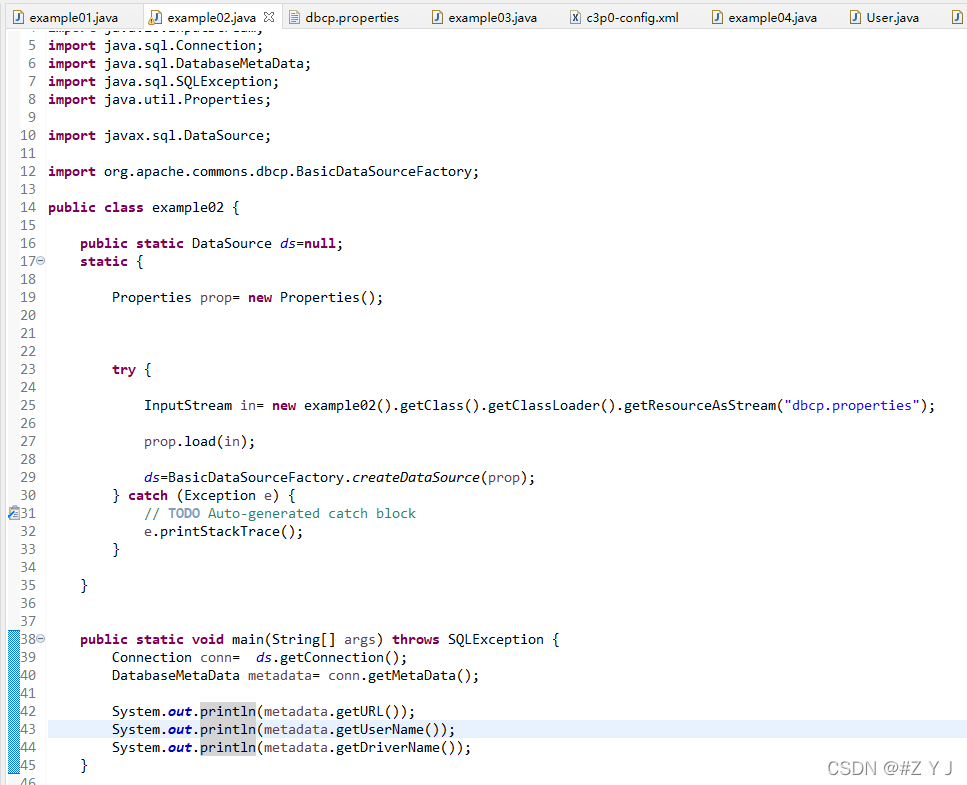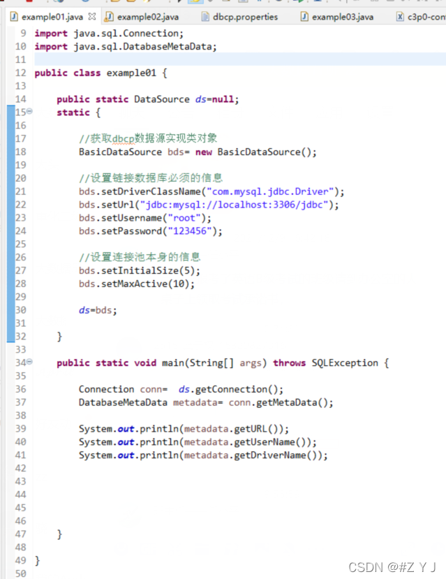 第二种:通过读取配置文件创建数据源对象,从而获取连接对象 (读取配置的好处:在不修改代码的情况,可以修改数据库的连接参数。) 除了使用BasicDataSource直接创建数据源对象外,还可以使用BasicDataSourceFactory工厂类读取配置文件,创建数据源对象,然后获取数据库连接对象。下面通过一个案例来演示,具体步骤如下。 (1)在chapter10项目的src目录下创建dbcpconfig.properties 文件,该文件用于设置数据库的连接信息和数据源的初始化信息。 (2)src目录下创建包cn.itcast.chapter10.example,并在该包下创建一个example02类,该类中采用了从配置文件中获取数据库的连接信息和数据源的初始化信息,具体如下: