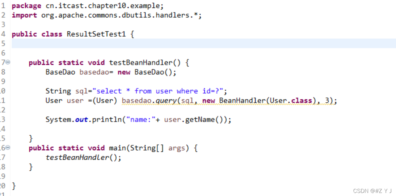 (5)在cnitcast.chapter10.example 包下创建类ResultSetTest1, 该类用于演示BeanHandler类对结果集的处理,具体代码如下:  在nicast chapler 1.exampme包下创建类RsesTetet该类用于演示Bensustander类对结果集的处理,具体代码如下:  注:有错误可以抛出异常