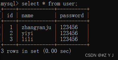 INSERT INTO user VALUES(1,'zhangyanju','123456'),