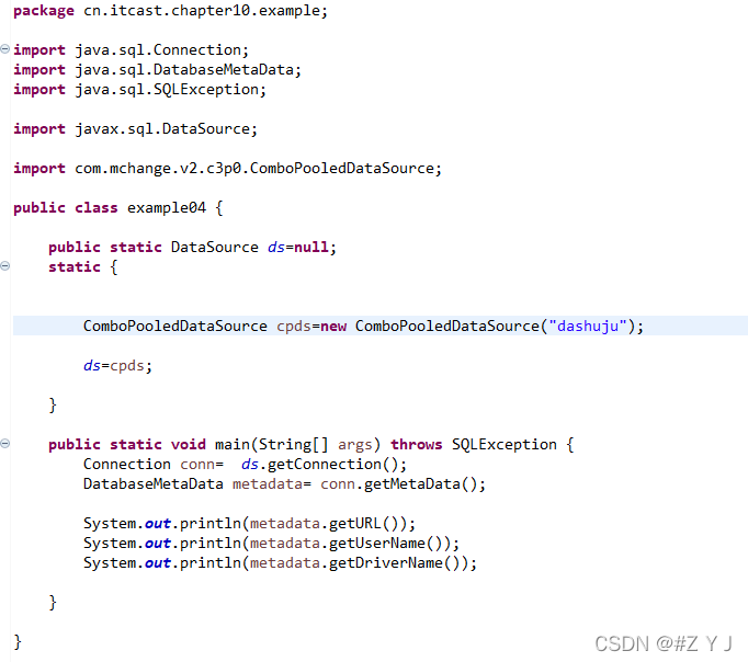(2)在cn.itcast.chapter10.example包下创建一个Example04类,该类中使用C3P0数据源从配置文件中获取Connection对象。  (2)运行main()方法后,程序的运行结果如图: