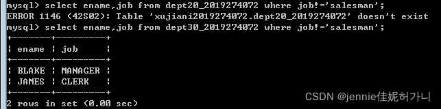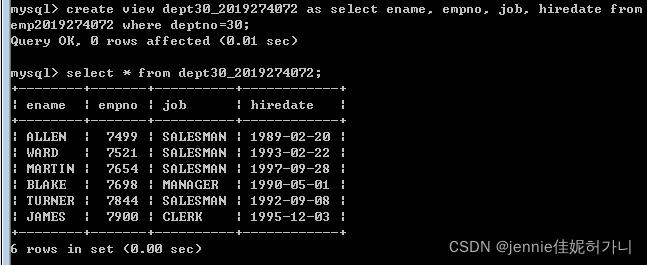create view dept30_2019274072 as select ename, empno, job, hiredate from emp2019274072 where deptno=30;  ? - Use the view to show employees in department 30 having jobs which are not salesman.